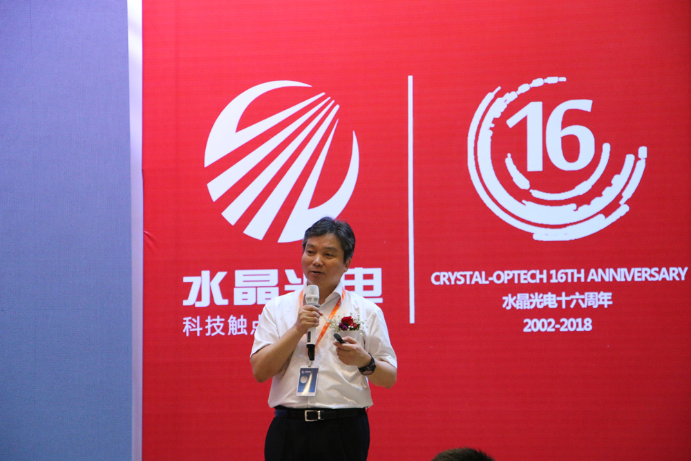 2018年8月2日,水晶光电迎来了16周年生日,当天上午,他们在综合楼三楼举行2018年忠诚员工入谱表彰仪式暨水晶商学院讲座及“晶才计划”启动仪式。董事长林敏,董事、副总经理盛永江等领导班子以及公司各职能中心和事业部、分子公司的领导和员工代表参加了此次活动。活动期间,董事长林敏作了题为《水晶二次发展新格局》的专题讲座,深度阐述了公司未来发展思路,为公司的下一阶段发展指明了更加清晰的方向。
