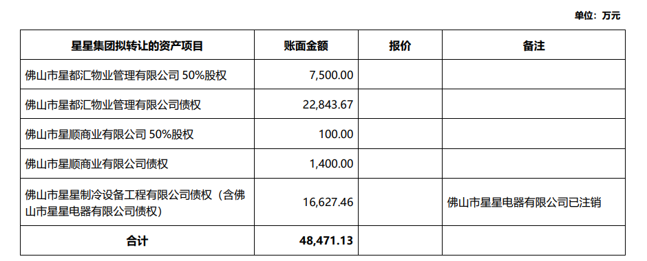 德州扑克app 拟将持有的佛山市星都汇物业管理有限公司、佛山市星顺商业有限公司等 2 家公司的股权及债权;以及佛山市德州扑克app 制冷设备工程有限公司债权合计 4.85 亿元资产一并打包转让。